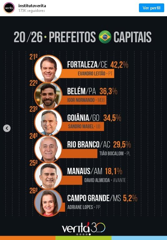 A pesquisa do Instituto Veritá confirma o ranking dos prefeitos feito pela Consultoria AtlasIntel, divulgado em dezembro de 2025 e rebatido por David Almeida, que chamou de “otário”, a população que acredita em pesquisas.