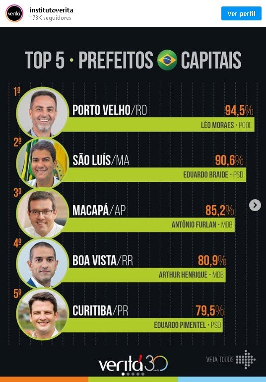 O prefeito mais bem pontuado na pesquisa do Instituto Veritá é o prefeito Léo Moraes (Podemos), de Porto Velho no estado de Rondônia, com 94,5% de aprovação. David ficou em 25º colocado, com apenas 18,1% de aprovação.