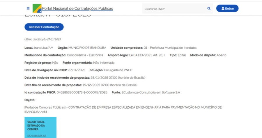 O Portal da Transparência da Prefeitura de Iranduba está desatualizado dificultando o acompanhamento da aplicação de recursos, não detalha quais ruas seriam atendidas pelas licitações e quais os prazos de execução das obras.