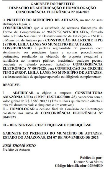 De acordo com o Diário Oficial dos Municípios (DOM), desta segunda-feira (10/11), Thomé contratou a empresa CONSTRUTORA AMAZÔNIA LTDA, pelo valor total de R$ 3.583.200,51 (Três milhões quinhentos e oitenta e três mil duzentos reais e cinquenta e um centavos).