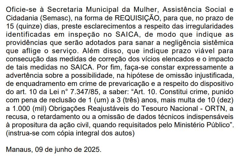 Diante da gravidade da denúncia, o MP deu um prazo 15 dias para que a Secretaria Municipal da Mulher, Assistência Social e Cidadania (Semasc) – comandada por Saullo Vianna, aliado do prefeito David Almeida (Avante) – explique o escândalo e apresente medidas imediatas para conter o desastre institucional.