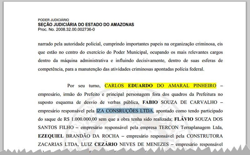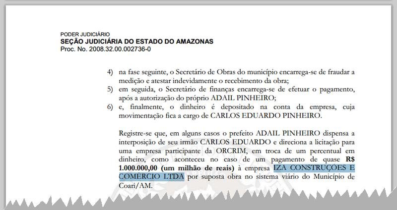 A decisão de Ferraz causa revolta porque ignora completamente o passado criminal da empresa. A PF comprovou que o dono da Iza Construções, Fábio Souza de Carvalho, pagou R$ 500 mil em propina a Adail Pinheiro como parte de um acordo clandestino para liberar pagamentos da Prefeitura de Coari. O próprio empresário confessou o crime em depoimento à Justiça Federal, detalhando que só receberia o valor contratado se repassasse metade ao grupo político que comandava o esquema.