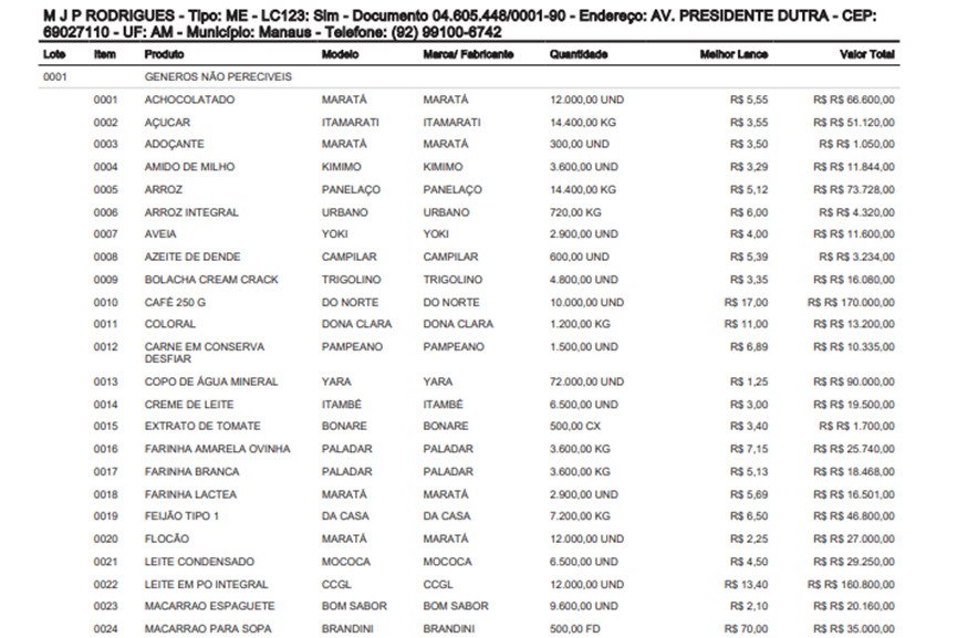 A empresa beneficiada com o “super contrato” é a M. J. P. RODRIGUES LTDA, que segundo o documento da licitação, foram comprados mais de 12 mil pacotes de achocolatado, ao custo médio deR$ 117 mil, além de 14.400 quilos de arroz, orçados em R$ 145 mil.
