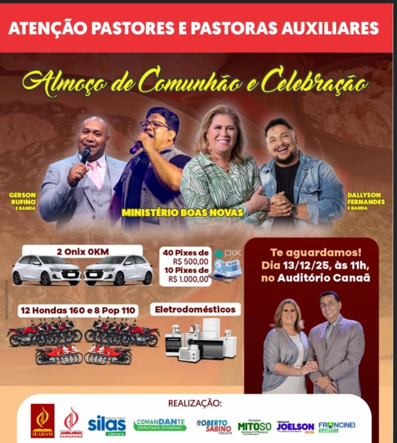 Com um convite atribuído para líderes religiosos, o evento denominado “Almoço de Comunhão e Celebração”, que está marcado para o dia 13 deste mês, deve acontecer no auditório Canaã, na Avenida Rodrigo Otávio, bairro do Japiim, zona Sul da capital.