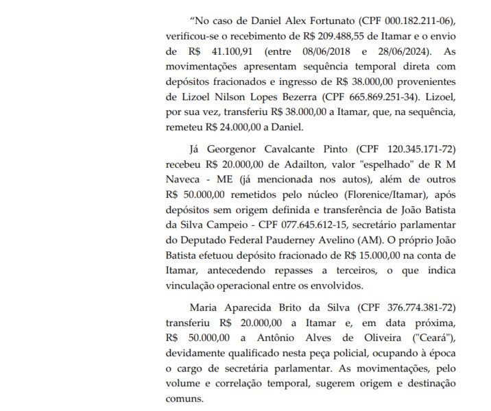 No documento da Polícia Federal, foram destacados que João Batista da Silva Campeio, movimento cerca de R$ 15 mil reais de maneira fracionado, na conta de Itamar de Souza Santana, secretário parlamentar do deputado Carlo Jordy (PL/RJ), um dos alvos da operação.