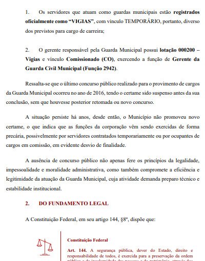 Ainda segundo o documento, os servidores temporários e comissionados estão registrados como “vigias” e não como guarda municipal, como determinha a Lei. A situação, conforme a denunciante, viola os princípios da legalidade, moralidade e impessoalidade previstos no artigo 37 da Constituição Federal.