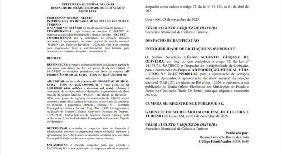 De acordo com publicações do Diário Oficial dos Municípios (DOM), Adail Pinheiro (Republicanos), contratou para a festa de Réveillon que irá acontecer entre os dias 29 e 31 de dezembro, no Centro Cultural de Coari, os cantores de Marcynho Sensação, Klessinha e Pablo do Arrocha, por valores exorbitantes.