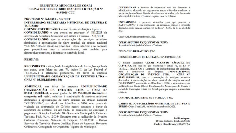 A Unipublicidade Organização de Eventos LTDA, responsável pelo show da cantora Klessinha, possui contratos de alto valor com a Prefeitura de Manaus, por meio da Fundação Municipal de Cultura, Turismo e Eventos (Manauscult), durante a atual gestão municipal.