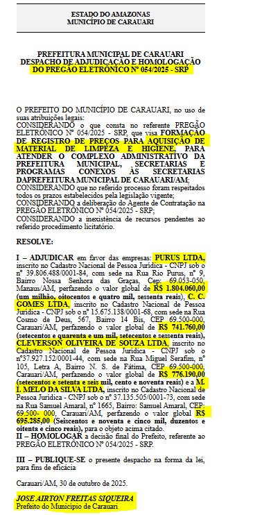 O prefeito Airton Siqueira (MDB) vai gastar mais de R$ 4 milhões de reais para a compra de material de limpeza e higiene, para segundo ele, atender as demandas da Prefeitura de Carauari, no interior do Amazonas.