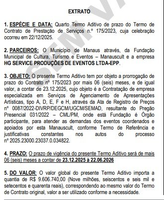 No novo aditivo de contrato, a HG SERVICE PRODUÇÕES DE EVENTOS LTDA – EPP vai receber o total de R$ 9.606.740,00 (nove milhões, seiscentos e seis mil, setecentos e quarenta reais), para o agenciamento de artistas, para atender as demandas da Prefeitura de Manaus.