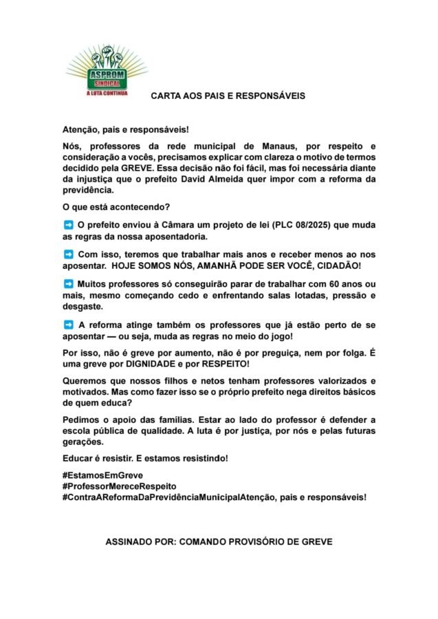 Durante assembleia geral de professores e pedagogos realizada nesta sexta-feira (07/11), aprovou uma greve geral da categoria após a aprovação do Projeto de Lei Complementar (PLC) nº 08/2025, de autoria do prefeito David Almeida (Avante), que propõe uma reforma na Previdência Municipal, foi decretado uma greve geral em Manaus.