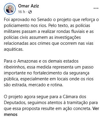 O senador Omar Aziz (PSD-AM), comemorou em suas redes sociais nesta terça-feira (11/11), a aprovação do projeto que obriga as polícias civis e militares a criarem unidades específicas para investigar crimes e fazer rondas nos rios.