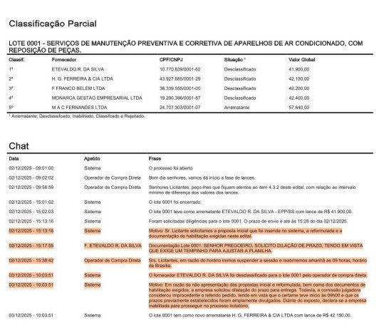 Segundo a empresa denunciante, esse prazo não estava previsto no edital nem foi informado previamente no sistema, o que teria comprometido a igualdade entre os concorrentes, podendo levar dano ao erário público.