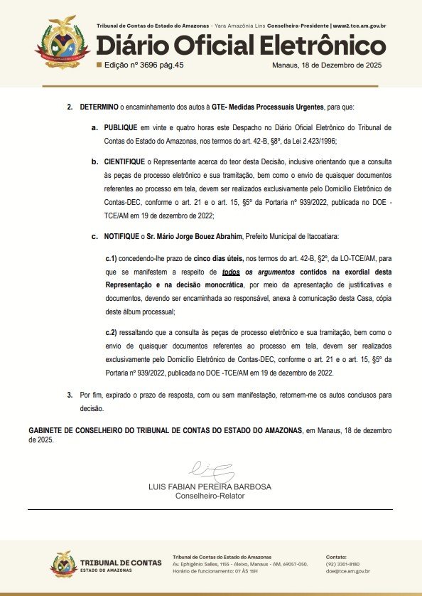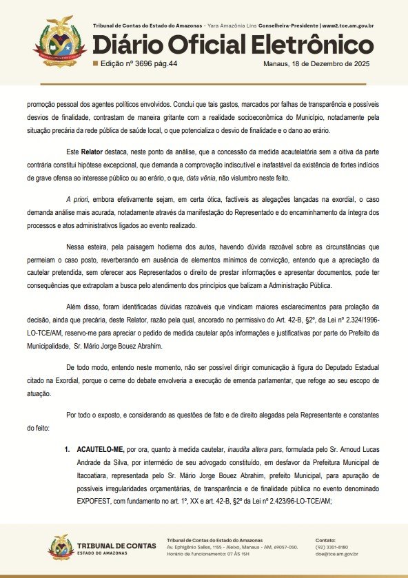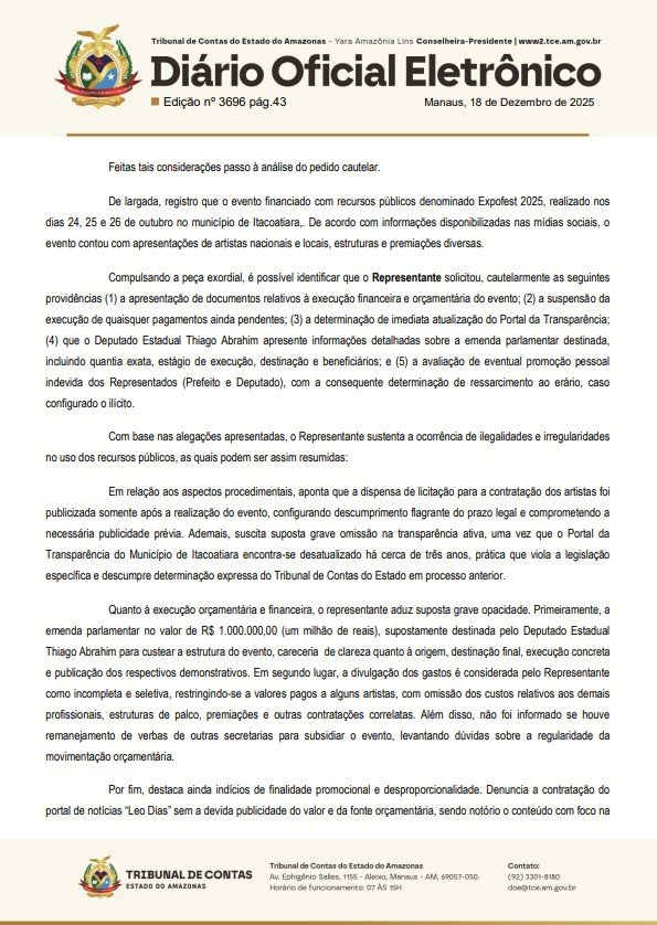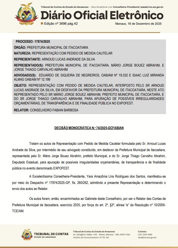 O Tribunal de Contas do Estado do Amazonas (TCE-AM), acatou uma representação com pedido de cautelar contra a Prefeitura de Itacoatiara, o prefeito Mário Abrahim (Republicanos) e o deputado Thiago Abrahim (UB), para que o órgão apure possíveis irregularidades orçamentárias e de transparência da Expofest 2025.