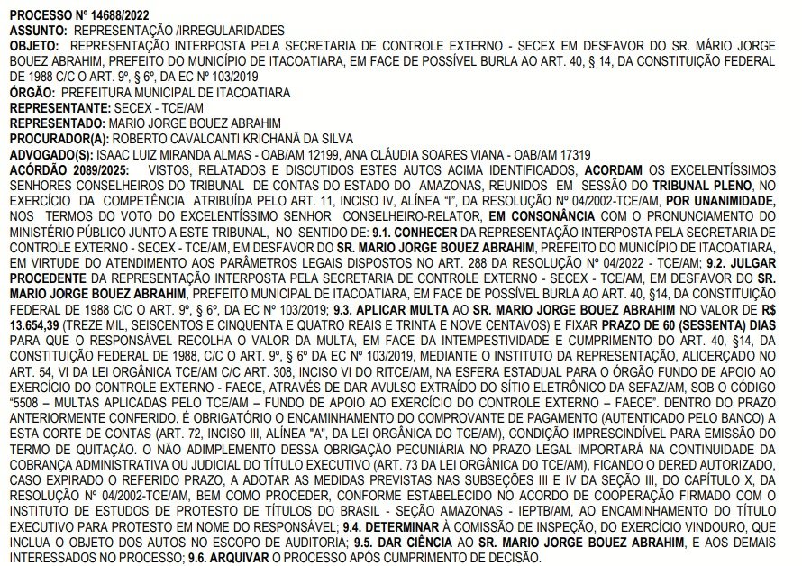 O Tribunal de Contas do Estado do Amazonas (TCE-AM), acatou um pedido de representação com medida cautelar, contra a Prefeitura de Itacoatiara e seu gestor Mário Abrahim (Republicanos), por burlar dispositivos da Constituição Federal e da Reforma da Previdência no município.
