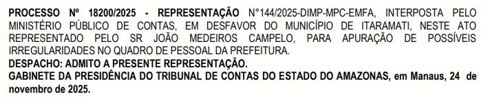 O Tribunal de Contas do Estado do Amazonas (TCE-AM), acatou um pedido de representação com medida cautelar contra a Prefeitura de Itamarati e seu gestor, João Campelo (MDB), para apuração de possíveis irregularidades no quadro de pessoal da administração municipal.