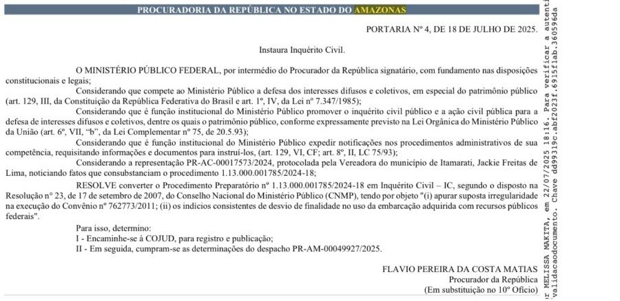 De acordo com a publicação feita no Diário Oficial do órgão, o MPF instalou um inquérito civil público e uma ação civil pública para investigar danos ao erário e ao patrimônio público em Itamarati.