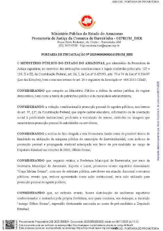 O Ministério Público do Amazonas (MP-AM) vai investigar um possível desvio de finalidade e uso indevido da máquina pública, pelo atual prefeito de Barreirinha Darlan Taveira (UB), para promover a imagem do ex-prefeito Glênio Seixas (UB), que é pré-candidato ao cargo de deputado estadual para as eleições de 2026.
