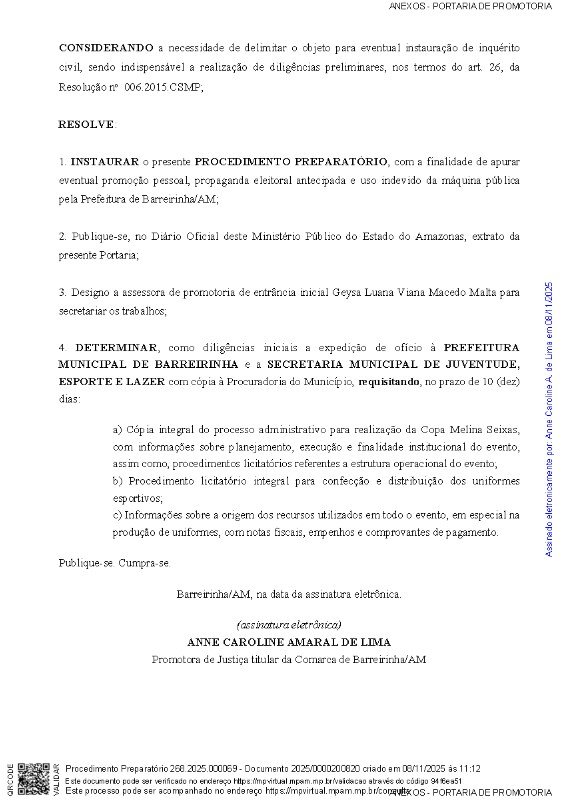 A promotora de justiça Anne Caroline Amaral de Lima, titular da Comarca de Barreirinha, determinou que Prefeitura de Barreirinha e a Secretaria Municipal de Juventude, Esporte e Lazer, detalhem o processo administrativo licitatório, sobre a origem dos recursos utilizados para a confecção desse material.