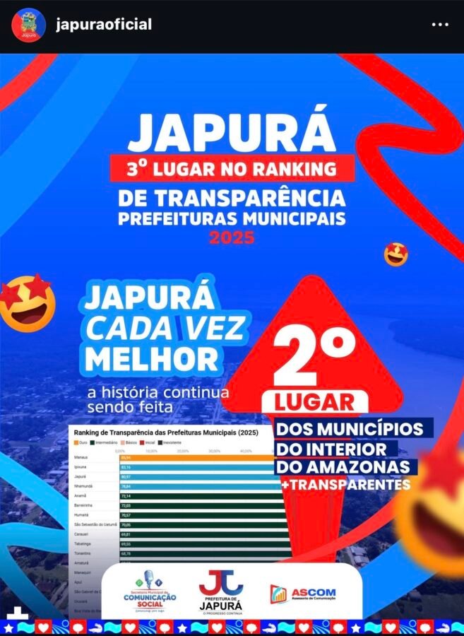 A eficiência administrativa da gestão Vanilso Monteiro também se reflete nos indicadores de controle e transparência. Japurá conquistou o 2º lugar no ranking de transparência pública, posicionando-se entre os municípios mais bem avaliados do Amazonas em acesso à informação, prestação de contas e governança.