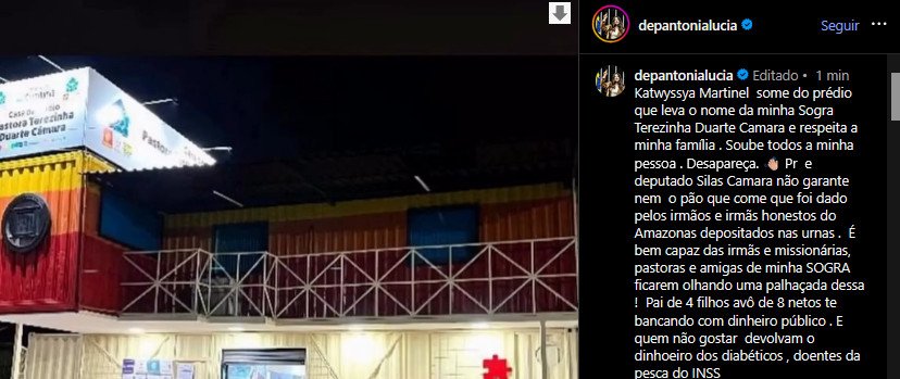 Antônia Lúcia publicou uma foto da Casa de Apoio Pastora Terezinha Duarte Câmara, instituição localizada em Rio Preto da Eva (AM), e ordenou que a vereadora “desapareça” do local.