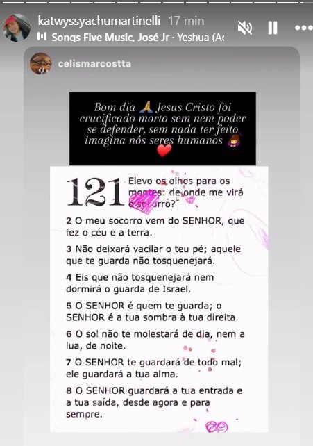“Bom dia. Jesus Cristo foi crucificado morto sem nem poder se defender, sem nada ter feito imagina nós seres humanos”, escreveu ela.